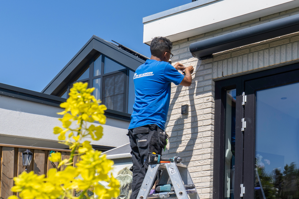 Je zonnescherm is nu ingemeten en besteld. Nu moet hij nog aan je gevel komen te hangen. Onze monteurs hebben alles in huis om jouw nieuwe scherm vakkundig voor je op te hangen. Samen spreken we een datum af waarop wij langskomen om je zonescherm te monteren.