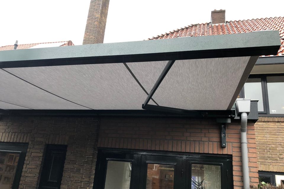 Voordat het zonnescherm gemonteerd kon worden moest het boeideel worden uitgevuld. Om de allerbeste montage te garanderen zijn er speciale beugels op maat gefabriceerd, exact in dezelfde kleur als het knikarmscherm. Het zonnescherm wordt aangedreven door een fluisterstille Somfy IO motor. Met één druk op de afstandsbediening is het zonnescherm simpel te bedienen. De klant heeft gekozen voor een waterbestendig zonweringdoek, dus ook bij een kleine regenbui kan de familie Gommels lekker buiten zitten.
