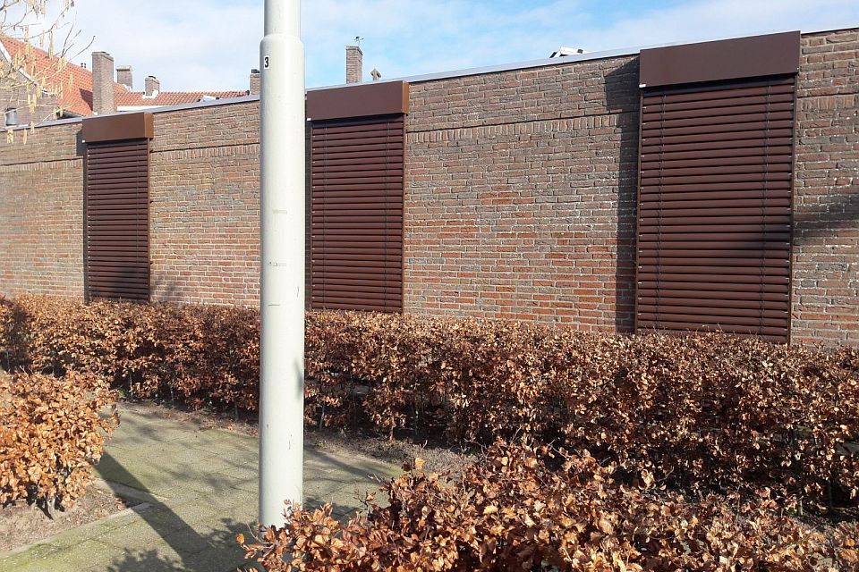 Met buitenjaloezieën worden zonnestralen optimaal gereflecteerd terwijl het zicht naar buiten behouden blijft. Dit systeem is voor ieder type raam of pui geschikt en heeft als voordeel dat kozijnen en vensterbanken binnen vrij blijven. Bovendien staat het garant voor een moderne uitstraling. De buitenjaloezieën van de familie Meeuwissen werden volledig op maat gemaakt in een duurzame kwaliteit krasvast aluminium en uitgevoerd in de kleur sepiabruin (RAL 8014).