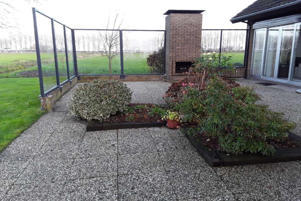 Er is voor dit project gekozen voor de Verano Biarritz V730. Dit windscherm van 5mm gehard glas is volledig op maat gemaakt. Er zijn speciaal gefabriceerde voetplaten gemonteerd, waardoor het windscherm op een bestaand muurtje geplaatst kon worden, zonder dat deze eerst weggehaald moest worden. Samen met de antractiegrijs gekozen kleur levert dit een heel mooi resultaat op.