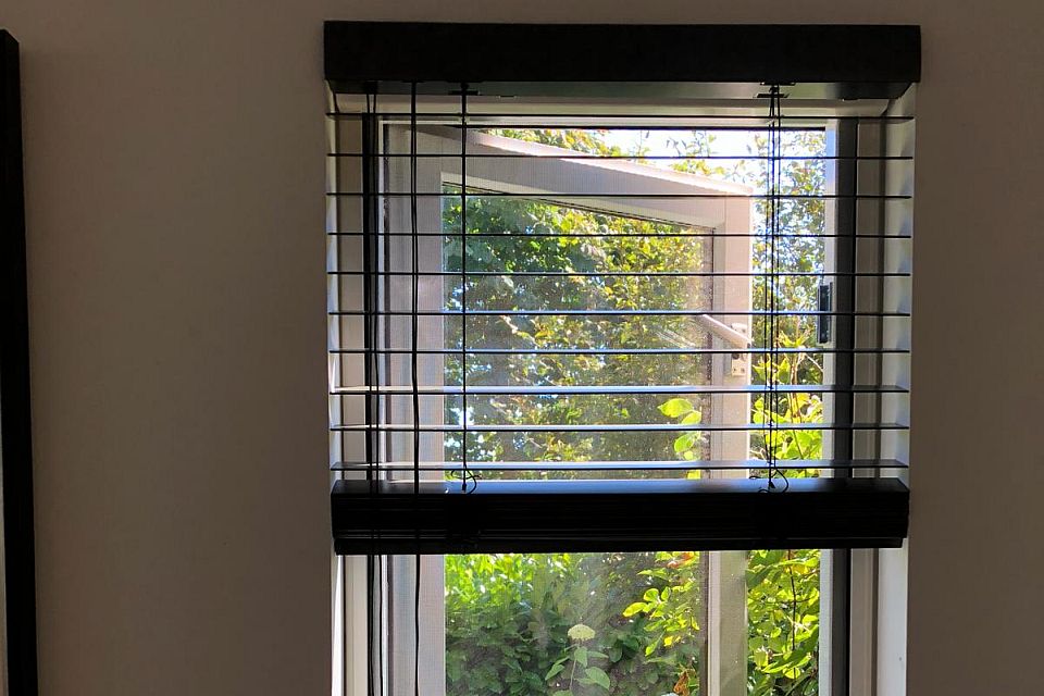 De jaloezieën zijn zoals vanzelfsprekend tot op de millimeter nauwkeurig ingemeten en gemonteerd. Dankzij de kantelbare lamellen kan de klant zelf de mate van lichtinval bepalen. De bediening is ook geen enkel probleem met de bijgeleverde bedieningskoorden.