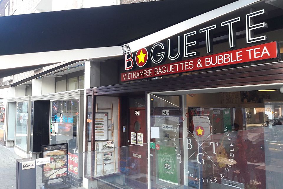 Vietnamese broodjeszaak Boguette in Rotterdam zocht een praktische en uitnodigende zonwering. Zon en Scherm monteerde hier de Verano Santos V296, een knikarmscherm dat helemaal op maat is gemaakt. Het heeft een breedte van 4,70 meter en is voorzien van waterdicht zwart doek met het daarop het logo geprint. De uitval is maar liefst 3,50 meter. De geïntegreerde led-verlichting, die in de knikarmen zijn verwerkt, versterkt de sfeer op het terras optimaal.