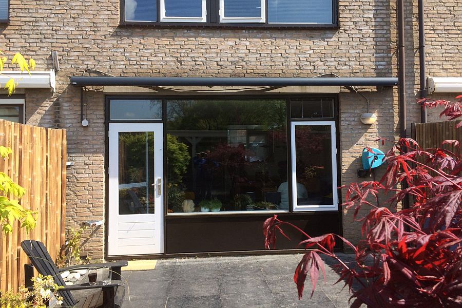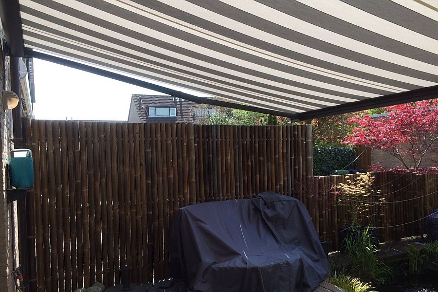 Het zonnescherm heeft een breedte van 5 meter en een uitval van maar liefst 3.5 meter! Hierdoor is het hele terras goed overdekt met een knikarmscherm en kan het echtpaar nu de hele dag genieten van hun pensioen in de schaduw.