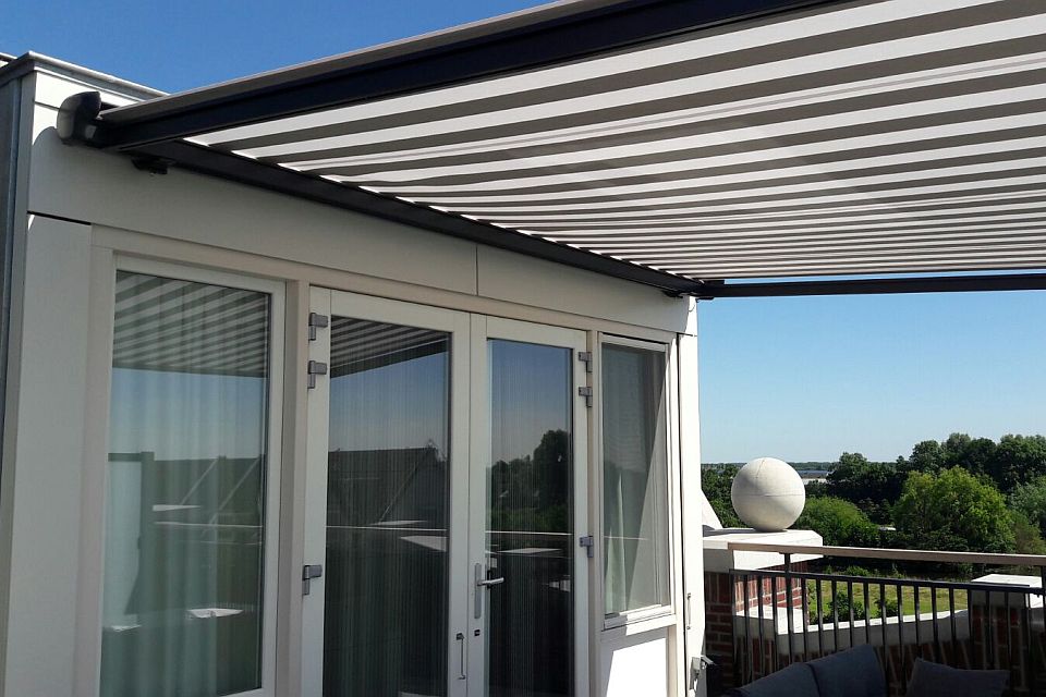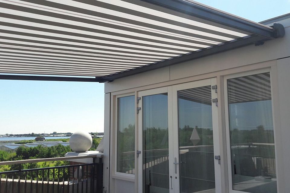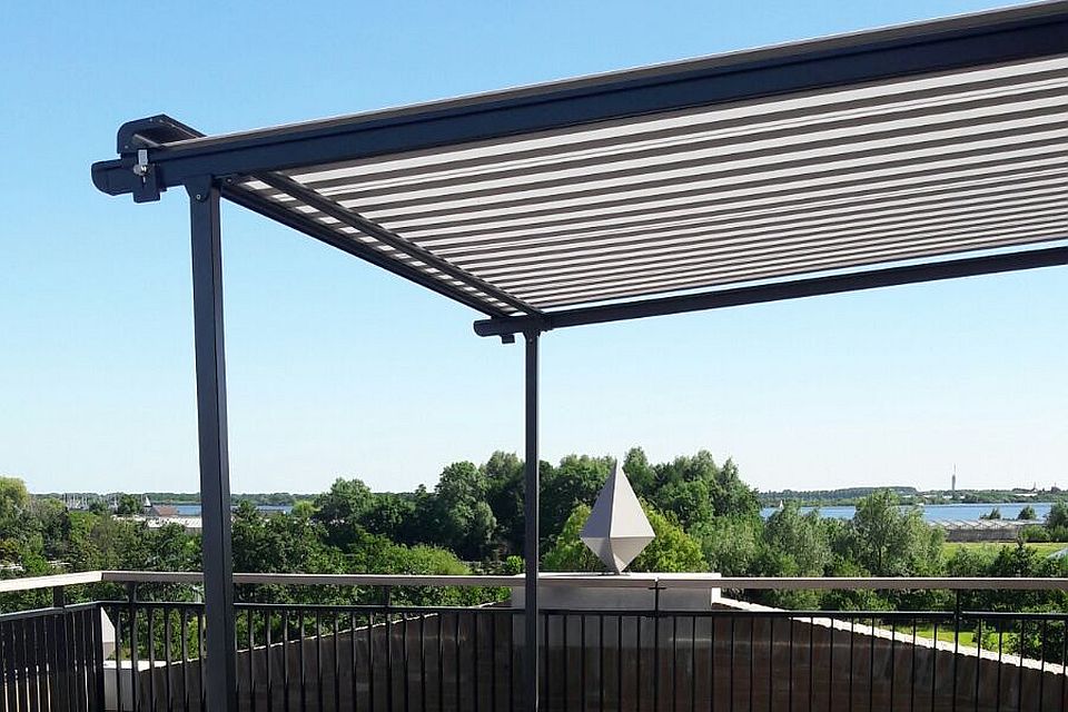 De Stobag P3000 Pergolino zonweringen zijn royaal, stijlvol en vrijwel overal toepasbaar. Behalve dat de staanders in verschillende kleuren leverbaar zijn, is er ook volop keuze in tinten en doekdessins. Ook op hoger gelegen terrassen zijn ze goed toepasbaar. Zo werden er bij dit project nog extra windvergrendelingen aangebracht, zodat de pergolino ’s in uitgeschoven stand prima weerstand kunnen bieden tegen harde wind.