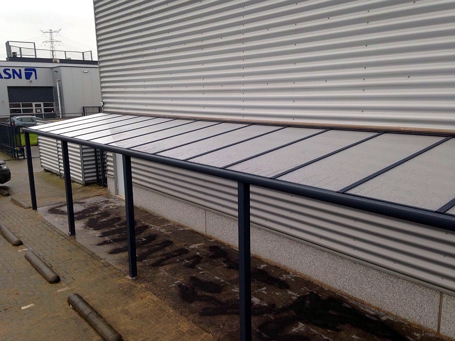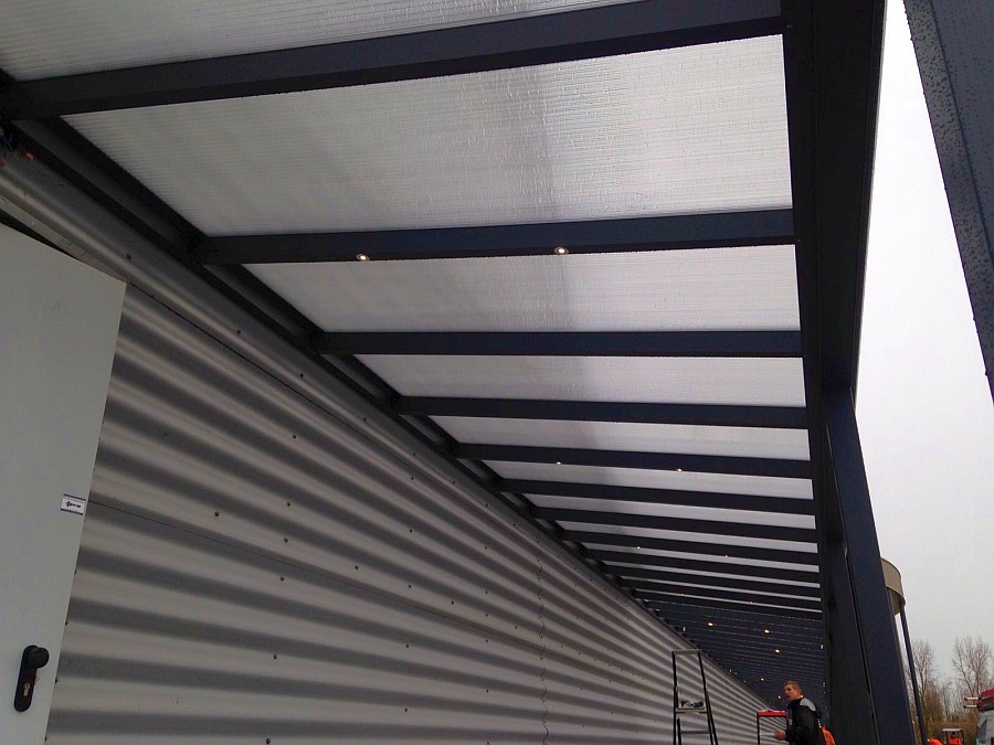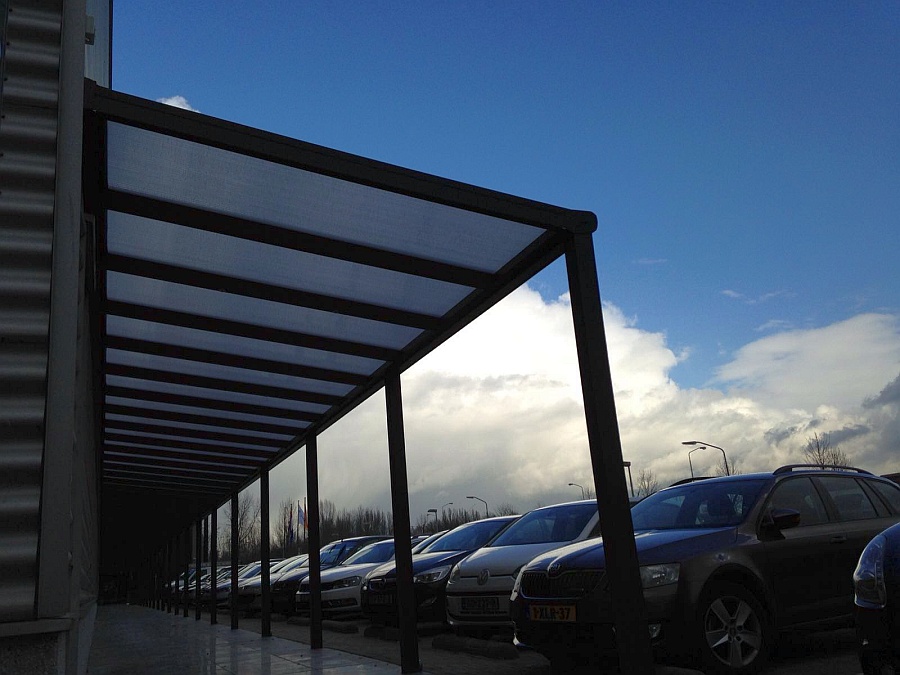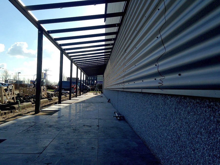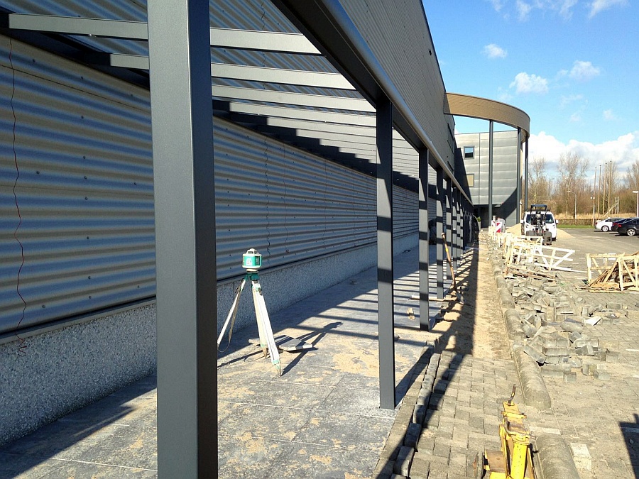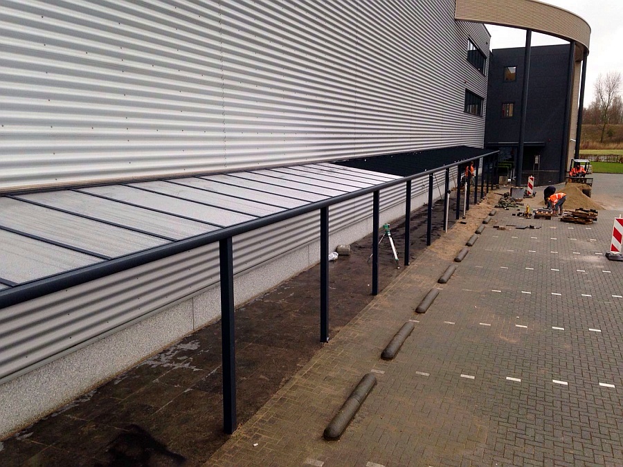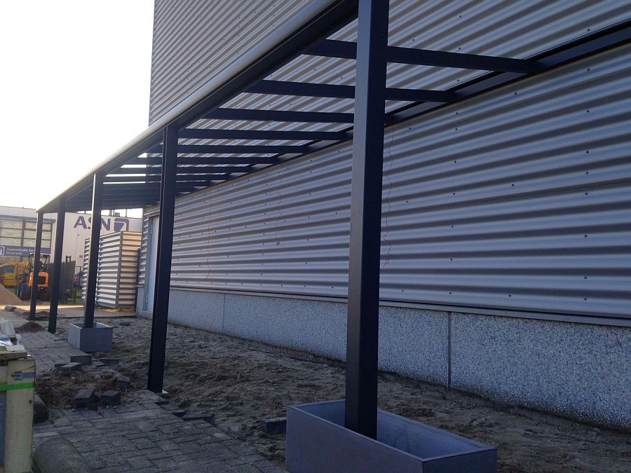 Gezien dit een heel groot pand betreft is er een “droogloper” gemaakt van de Verano Iseo overkapping van meer dan 50 meter lang. Daarnaast hebben wij in dit project (in samenwerking met Tuinholland) een nieuwe bestrating gelegd met bloembakken rondom enkele staanders van de Verano Iseo overkapping.
