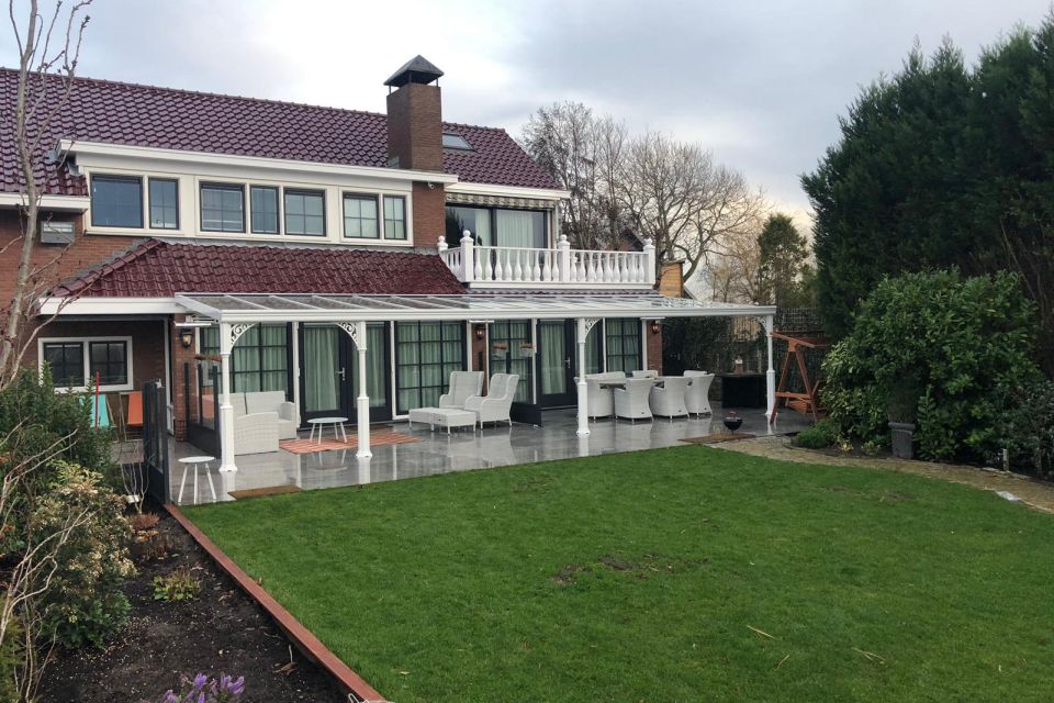 De terrasoverkapping is naar wens van de klant samengesteld. De overkapping is ruim 11 meter breed gemaakt in combinatie met een uitval van 3,5 meter. De liggers en staanders zijn in het wit gefabriceerd. Het dak bestaat uit 55.2 helder veiligheidsglas. De afdichtingsrubbers en klassieke gootprofiel aan de voorzijde zorgen voor een nette afwerking. Het genieten kan nu echt beginnen.