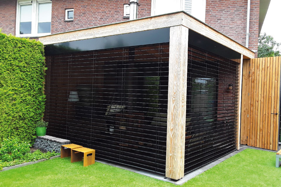 De zwarte buitenjaloezieën zijn gemaakt van aluminium en hebben een speciale S-vorm waardoor ze de zon perfect weren. In de zomer kun je hierdoor heerlijk uit de zon zitten en zelf spelen met het licht, sfeer en de mate van inkijk!